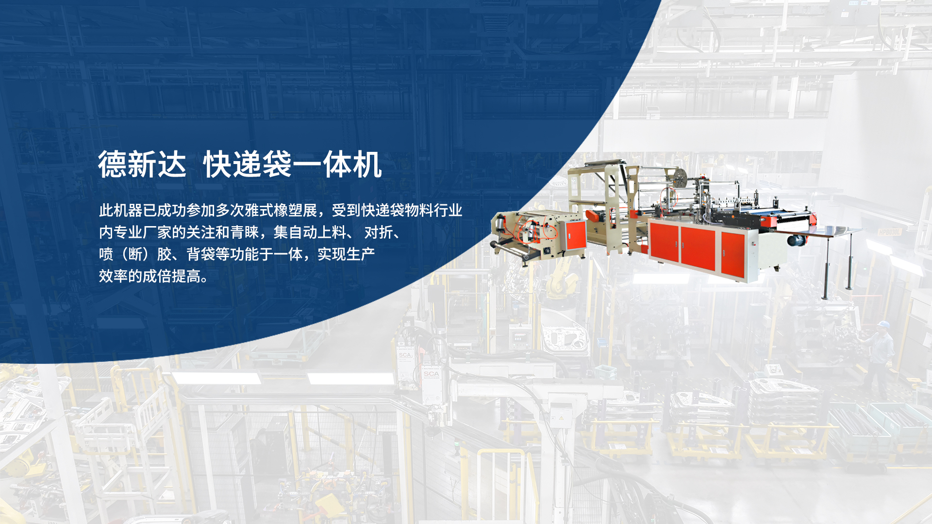 此機(jī)器已經(jīng)成功參加多次雅式橡塑展,受到快遞袋物料行業(yè)專(zhuān)業(yè)廠(chǎng)家的關(guān)注和青睞,主要功能有自動(dòng)上料、對(duì)折、噴(斷)膠、背袋等功能,從根本上實(shí)現(xiàn)一機(jī)頂三機(jī),一人頂多人,提高生產(chǎn)效率。